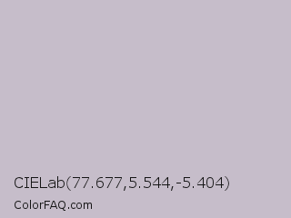 CIELab 77.677,5.544,-5.404 Color is a light purple color and the nearest color is Gray Suit #c1becd. Hex code #c6bdca and RGB value is rgb(198,189,202). In RGB color space, this color is composed of 78% red, 74% green, 79% blue, In CMYK color space, this color is composed of 2% cyan, 6% magenta, 0% yellow , 21% black , In HSL color space, this color has a hue angle of 282° , 11% saturation and 77% lightness.