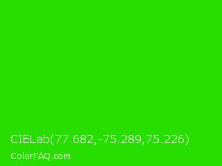 CIELab 77.682,-75.289,75.226 Color is a normal green color and the nearest color is Harlequin #3fff00. Hex code #27de00 and RGB value is rgb(39,222,0). In RGB color space, this color is composed of 15% red, 87% green, 0% blue, In CMYK color space, this color is composed of 82% cyan, 0% magenta, 100% yellow , 13% black , In HSL color space, this color has a hue angle of 109° , 100% saturation and 44% lightness.