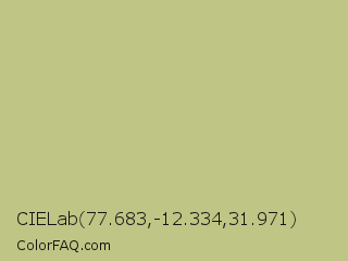 CIELab 77.683,-12.334,31.971 Color is a light yellow color and the nearest color is Sage #bcb88a. Hex code #bfc584 and RGB value is rgb(191,197,132). In RGB color space, this color is composed of 75% red, 77% green, 52% blue, In CMYK color space, this color is composed of 3% cyan, 0% magenta, 33% yellow , 23% black , In HSL color space, this color has a hue angle of 66° , 36% saturation and 65% lightness.