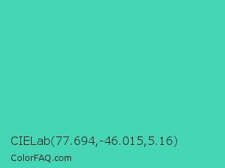 CIELab 77.694,-46.015,5.16 Color is a normal cyan color and the nearest color is Eucalyptus #44d7a8. Hex code #45d6b5 and RGB value is rgb(69,214,181). In RGB color space, this color is composed of 27% red, 84% green, 71% blue, In CMYK color space, this color is composed of 68% cyan, 0% magenta, 15% yellow , 16% black , In HSL color space, this color has a hue angle of 166° , 64% saturation and 55% lightness.