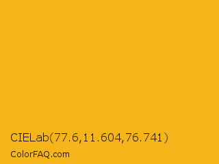 CIELab 77.6,11.604,76.741 Color is a normal orange color and the nearest color is Buttercup #f3ad16. Hex code #f5b51a and RGB value is rgb(245,181,26). In RGB color space, this color is composed of 96% red, 71% green, 10% blue, In CMYK color space, this color is composed of 0% cyan, 26% magenta, 89% yellow , 4% black , In HSL color space, this color has a hue angle of 42° , 92% saturation and 53% lightness.