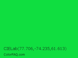 CIELab 77.706,-74.235,61.613 Color is a normal green color and the nearest color is Malachite #0bda51. Hex code #0fde40 and RGB value is rgb(15,222,64). In RGB color space, this color is composed of 6% red, 87% green, 25% blue, In CMYK color space, this color is composed of 93% cyan, 0% magenta, 71% yellow , 13% black , In HSL color space, this color has a hue angle of 134° , 87% saturation and 46% lightness.