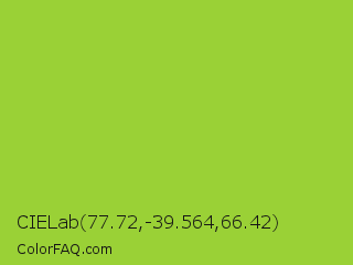 CIELab 77.72,-39.564,66.42 Color is a normal green color and the nearest color is Yellow Green #9acd32. Hex code #9ad136 and RGB value is rgb(154,209,54). In RGB color space, this color is composed of 60% red, 82% green, 21% blue, In CMYK color space, this color is composed of 26% cyan, 0% magenta, 74% yellow , 18% black , In HSL color space, this color has a hue angle of 81° , 63% saturation and 52% lightness.