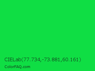 CIELab 77.734,-73.881,60.161 Color is a normal green color and the nearest color is Malachite #0bda51. Hex code #0fde44 and RGB value is rgb(15,222,68). In RGB color space, this color is composed of 6% red, 87% green, 27% blue, In CMYK color space, this color is composed of 93% cyan, 0% magenta, 69% yellow , 13% black , In HSL color space, this color has a hue angle of 135° , 87% saturation and 46% lightness.