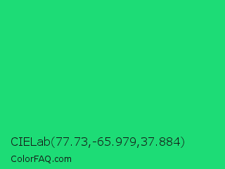 CIELab 77.73,-65.979,37.884 Color is a normal green color and the nearest color is UFO Green #3cd070. Hex code #1ddc76 and RGB value is rgb(29,220,118). In RGB color space, this color is composed of 11% red, 86% green, 46% blue, In CMYK color space, this color is composed of 87% cyan, 0% magenta, 46% yellow , 14% black , In HSL color space, this color has a hue angle of 148° , 77% saturation and 49% lightness.