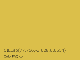 CIELab 77.766,-3.028,60.514 Color is a normal yellow color and the nearest color is Anzac #e0b646. Hex code #dbbf4a and RGB value is rgb(219,191,74). In RGB color space, this color is composed of 86% red, 75% green, 29% blue, In CMYK color space, this color is composed of 0% cyan, 13% magenta, 66% yellow , 14% black , In HSL color space, this color has a hue angle of 48° , 67% saturation and 57% lightness.