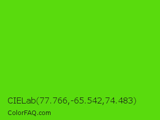 CIELab 77.766,-65.542,74.483 Color is a normal green color and the nearest color is Harlequin Green #46cb18. Hex code #59db0d and RGB value is rgb(89,219,13). In RGB color space, this color is composed of 35% red, 86% green, 5% blue, In CMYK color space, this color is composed of 59% cyan, 0% magenta, 94% yellow , 14% black , In HSL color space, this color has a hue angle of 98° , 89% saturation and 45% lightness.