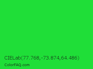 CIELab 77.768,-73.874,64.486 Color is a normal green color and the nearest color is Lime Green #32cd32. Hex code #1fde38 and RGB value is rgb(31,222,56). In RGB color space, this color is composed of 12% red, 87% green, 22% blue, In CMYK color space, this color is composed of 86% cyan, 0% magenta, 75% yellow , 13% black , In HSL color space, this color has a hue angle of 128° , 75% saturation and 50% lightness.