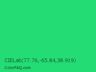 CIELab 77.76,-65.84,38.919 Color is a normal green color and the nearest color is UFO Green #3cd070. Hex code #23dc74 and RGB value is rgb(35,220,116). In RGB color space, this color is composed of 14% red, 86% green, 45% blue, In CMYK color space, this color is composed of 84% cyan, 0% magenta, 47% yellow , 14% black , In HSL color space, this color has a hue angle of 146° , 73% saturation and 50% lightness.