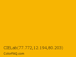 CIELab 77.772,12.194,80.203 Color is a normal orange color and the nearest color is UCLA Gold #ffb300. Hex code #f7b502 and RGB value is rgb(247,181,2). In RGB color space, this color is composed of 97% red, 71% green, 1% blue, In CMYK color space, this color is composed of 0% cyan, 27% magenta, 99% yellow , 3% black , In HSL color space, this color has a hue angle of 44° , 98% saturation and 49% lightness.