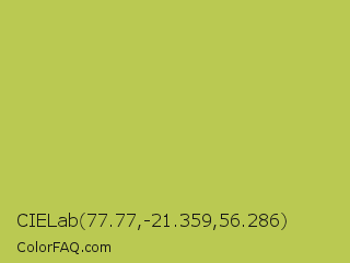 CIELab 77.77,-21.359,56.286 Color is a normal yellow color and the nearest color is Celery #b8c25d. Hex code #bac952 and RGB value is rgb(186,201,82). In RGB color space, this color is composed of 73% red, 79% green, 32% blue, In CMYK color space, this color is composed of 7% cyan, 0% magenta, 59% yellow , 21% black , In HSL color space, this color has a hue angle of 68° , 52% saturation and 55% lightness.