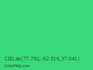 CIELab 77.792,-62.516,37.041 Color is a normal green color and the nearest color is UFO Green #3cd070. Hex code #38db78 and RGB value is rgb(56,219,120). In RGB color space, this color is composed of 22% red, 86% green, 47% blue, In CMYK color space, this color is composed of 74% cyan, 0% magenta, 45% yellow , 14% black , In HSL color space, this color has a hue angle of 144° , 69% saturation and 54% lightness.