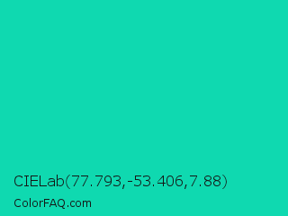CIELab 77.793,-53.406,7.88 Color is a normal cyan color and the nearest color is Amazonite #00c4b0. Hex code #0fd9b0 and RGB value is rgb(15,217,176). In RGB color space, this color is composed of 6% red, 85% green, 69% blue, In CMYK color space, this color is composed of 93% cyan, 0% magenta, 19% yellow , 15% black , In HSL color space, this color has a hue angle of 168° , 87% saturation and 45% lightness.