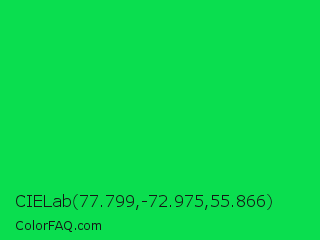 CIELab 77.799,-72.975,55.866 Color is a normal green color and the nearest color is Malachite #0bda51. Hex code #0ade4f and RGB value is rgb(10,222,79). In RGB color space, this color is composed of 4% red, 87% green, 31% blue, In CMYK color space, this color is composed of 95% cyan, 0% magenta, 64% yellow , 13% black , In HSL color space, this color has a hue angle of 140° , 91% saturation and 45% lightness.