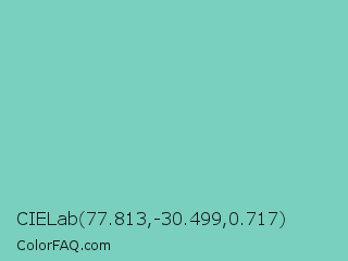 CIELab 77.813,-30.499,0.717 Color is a light cyan color and the nearest color is Bermuda #7dd8c6. Hex code #79d0be and RGB value is rgb(121,208,190). In RGB color space, this color is composed of 47% red, 82% green, 75% blue, In CMYK color space, this color is composed of 42% cyan, 0% magenta, 9% yellow , 18% black , In HSL color space, this color has a hue angle of 168° , 48% saturation and 65% lightness.