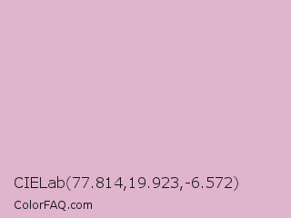 CIELab 77.814,19.923,-6.572 Color is a light magenta color and the nearest color is Pink Lavender #d8b2d1. Hex code #e0b4cd and RGB value is rgb(224,180,205). In RGB color space, this color is composed of 88% red, 71% green, 80% blue, In CMYK color space, this color is composed of 0% cyan, 20% magenta, 8% yellow , 12% black , In HSL color space, this color has a hue angle of 326° , 42% saturation and 79% lightness.