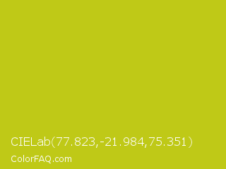 CIELab 77.823,-21.984,75.351 Color is a normal yellow color and the nearest color is Key Lime Pie #bfc921. Hex code #bfc917 and RGB value is rgb(191,201,23). In RGB color space, this color is composed of 75% red, 79% green, 9% blue, In CMYK color space, this color is composed of 5% cyan, 0% magenta, 89% yellow , 21% black , In HSL color space, this color has a hue angle of 63° , 79% saturation and 44% lightness.