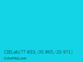 CIELab 77.833,-35.865,-20.971 Color is a normal cyan color and the nearest color is Bright Turquoise #08e8de. Hex code #12d4e6 and RGB value is rgb(18,212,230). In RGB color space, this color is composed of 7% red, 83% green, 90% blue, In CMYK color space, this color is composed of 92% cyan, 8% magenta, 0% yellow , 10% black , In HSL color space, this color has a hue angle of 185° , 85% saturation and 49% lightness.