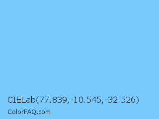 CIELab 77.839,-10.545,-32.526 Color is a light blue color and the nearest color is Malibu #7dc8f7. Hex code #7ac9fc and RGB value is rgb(122,201,252). In RGB color space, this color is composed of 48% red, 79% green, 99% blue, In CMYK color space, this color is composed of 52% cyan, 20% magenta, 0% yellow , 1% black , In HSL color space, this color has a hue angle of 204° , 96% saturation and 73% lightness.
