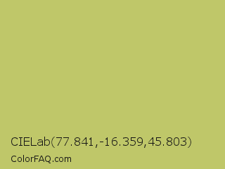 CIELab 77.841,-16.359,45.803 Color is a normal yellow color and the nearest color is Wild Willow #b9c46a. Hex code #bfc769 and RGB value is rgb(191,199,105). In RGB color space, this color is composed of 75% red, 78% green, 41% blue, In CMYK color space, this color is composed of 4% cyan, 0% magenta, 47% yellow , 22% black , In HSL color space, this color has a hue angle of 65° , 46% saturation and 60% lightness.