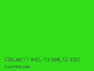 CIELab 77.843,-73.688,72.333 Color is a normal green color and the nearest color is Harlequin Green #46cb18. Hex code #30de1a and RGB value is rgb(48,222,26). In RGB color space, this color is composed of 19% red, 87% green, 10% blue, In CMYK color space, this color is composed of 78% cyan, 0% magenta, 88% yellow , 13% black , In HSL color space, this color has a hue angle of 113° , 79% saturation and 49% lightness.