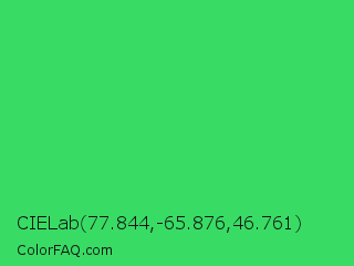 CIELab 77.844,-65.876,46.761 Color is a normal green color and the nearest color is UFO Green #3cd070. Hex code #38dc64 and RGB value is rgb(56,220,100). In RGB color space, this color is composed of 22% red, 86% green, 39% blue, In CMYK color space, this color is composed of 75% cyan, 0% magenta, 55% yellow , 14% black , In HSL color space, this color has a hue angle of 136° , 70% saturation and 54% lightness.
