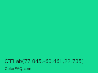 CIELab 77.845,-60.461,22.735 Color is a normal green color and the nearest color is Caribbean Green #00cc99. Hex code #14db94 and RGB value is rgb(20,219,148). In RGB color space, this color is composed of 8% red, 86% green, 58% blue, In CMYK color space, this color is composed of 91% cyan, 0% magenta, 32% yellow , 14% black , In HSL color space, this color has a hue angle of 159° , 83% saturation and 47% lightness.