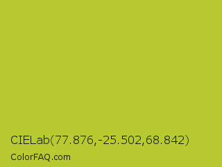 CIELab 77.876,-25.502,68.842 Color is a normal yellow color and the nearest color is Key Lime Pie #bfc921. Hex code #b7cb31 and RGB value is rgb(183,203,49). In RGB color space, this color is composed of 72% red, 80% green, 19% blue, In CMYK color space, this color is composed of 10% cyan, 0% magenta, 76% yellow , 20% black , In HSL color space, this color has a hue angle of 68° , 61% saturation and 49% lightness.