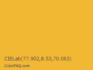 CIELab 77.902,8.53,70.063 Color is a normal orange color and the nearest color is Tulip Tree #eab33b. Hex code #f0b833 and RGB value is rgb(240,184,51). In RGB color space, this color is composed of 94% red, 72% green, 20% blue, In CMYK color space, this color is composed of 0% cyan, 23% magenta, 79% yellow , 6% black , In HSL color space, this color has a hue angle of 42° , 86% saturation and 57% lightness.