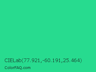 CIELab 77.921,-60.191,25.464 Color is a normal green color and the nearest color is Shamrock #33cc99. Hex code #27db8f and RGB value is rgb(39,219,143). In RGB color space, this color is composed of 15% red, 86% green, 56% blue, In CMYK color space, this color is composed of 82% cyan, 0% magenta, 35% yellow , 14% black , In HSL color space, this color has a hue angle of 155° , 71% saturation and 51% lightness.
