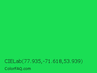 CIELab 77.935,-71.618,53.939 Color is a normal green color and the nearest color is Malachite #0bda51. Hex code #1ade54 and RGB value is rgb(26,222,84). In RGB color space, this color is composed of 10% red, 87% green, 33% blue, In CMYK color space, this color is composed of 88% cyan, 0% magenta, 62% yellow , 13% black , In HSL color space, this color has a hue angle of 138° , 79% saturation and 49% lightness.