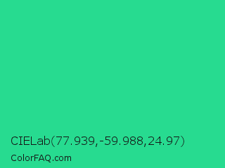 CIELab 77.939,-59.988,24.97 Color is a normal green color and the nearest color is Shamrock #33cc99. Hex code #27db90 and RGB value is rgb(39,219,144). In RGB color space, this color is composed of 15% red, 86% green, 56% blue, In CMYK color space, this color is composed of 82% cyan, 0% magenta, 34% yellow , 14% black , In HSL color space, this color has a hue angle of 155° , 71% saturation and 51% lightness.