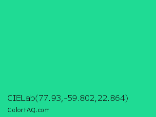 CIELab 77.93,-59.802,22.864 Color is a normal green color and the nearest color is Shamrock #33cc99. Hex code #1fdb94 and RGB value is rgb(31,219,148). In RGB color space, this color is composed of 12% red, 86% green, 58% blue, In CMYK color space, this color is composed of 86% cyan, 0% magenta, 32% yellow , 14% black , In HSL color space, this color has a hue angle of 157° , 75% saturation and 49% lightness.