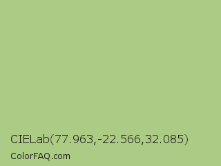 CIELab 77.963,-22.566,32.085 Color is a light green color and the nearest color is Swamp Green #acb78e. Hex code #accb84 and RGB value is rgb(172,203,132). In RGB color space, this color is composed of 67% red, 80% green, 52% blue, In CMYK color space, this color is composed of 15% cyan, 0% magenta, 35% yellow , 20% black , In HSL color space, this color has a hue angle of 86° , 41% saturation and 66% lightness.