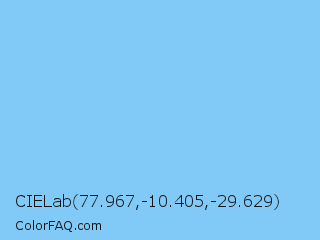 CIELab 77.967,-10.405,-29.629 Color is a light blue color and the nearest color is Malibu #7dc8f7. Hex code #81c9f7 and RGB value is rgb(129,201,247). In RGB color space, this color is composed of 51% red, 79% green, 97% blue, In CMYK color space, this color is composed of 48% cyan, 19% magenta, 0% yellow , 3% black , In HSL color space, this color has a hue angle of 203° , 88% saturation and 74% lightness.