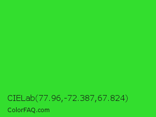 CIELab 77.96,-72.387,67.824 Color is a normal green color and the nearest color is Lime Green #32cd32. Hex code #33de2e and RGB value is rgb(51,222,46). In RGB color space, this color is composed of 20% red, 87% green, 18% blue, In CMYK color space, this color is composed of 77% cyan, 0% magenta, 79% yellow , 13% black , In HSL color space, this color has a hue angle of 118° , 73% saturation and 53% lightness.