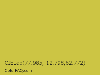 CIELab 77.985,-12.798,62.772 Color is a normal yellow color and the nearest color is Turmeric #cabb48. Hex code #ccc544 and RGB value is rgb(204,197,68). In RGB color space, this color is composed of 80% red, 77% green, 27% blue, In CMYK color space, this color is composed of 0% cyan, 3% magenta, 67% yellow , 20% black , In HSL color space, this color has a hue angle of 57° , 57% saturation and 53% lightness.