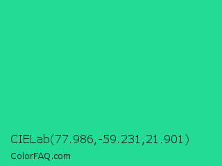 CIELab 77.986,-59.231,21.901 Color is a normal green color and the nearest color is Shamrock #33cc99. Hex code #21db96 and RGB value is rgb(33,219,150). In RGB color space, this color is composed of 13% red, 86% green, 59% blue, In CMYK color space, this color is composed of 85% cyan, 0% magenta, 32% yellow , 14% black , In HSL color space, this color has a hue angle of 158° , 74% saturation and 49% lightness.