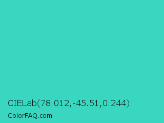 CIELab 78.012,-45.51,0.244 Color is a normal cyan color and the nearest color is Turquoise PWG #30d5c8. Hex code #39d7bf and RGB value is rgb(57,215,191). In RGB color space, this color is composed of 22% red, 84% green, 75% blue, In CMYK color space, this color is composed of 73% cyan, 0% magenta, 11% yellow , 16% black , In HSL color space, this color has a hue angle of 171° , 66% saturation and 53% lightness.