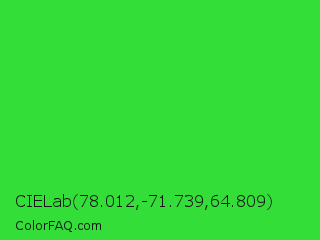 CIELab 78.012,-71.739,64.809 Color is a normal green color and the nearest color is Lime Green #32cd32. Hex code #33de38 and RGB value is rgb(51,222,56). In RGB color space, this color is composed of 20% red, 87% green, 22% blue, In CMYK color space, this color is composed of 77% cyan, 0% magenta, 75% yellow , 13% black , In HSL color space, this color has a hue angle of 122° , 72% saturation and 54% lightness.