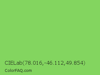 CIELab 78.016,-46.112,49.854 Color is a normal green color and the nearest color is Mantis #74c365. Hex code #83d55f and RGB value is rgb(131,213,95). In RGB color space, this color is composed of 51% red, 84% green, 37% blue, In CMYK color space, this color is composed of 38% cyan, 0% magenta, 55% yellow , 16% black , In HSL color space, this color has a hue angle of 102° , 58% saturation and 60% lightness.