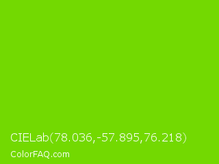 CIELab 78.036,-57.895,76.218 Color is a normal green color and the nearest color is Alien Armpit #84de02. Hex code #73d901 and RGB value is rgb(115,217,1). In RGB color space, this color is composed of 45% red, 85% green, 0% blue, In CMYK color space, this color is composed of 47% cyan, 0% magenta, 100% yellow , 15% black , In HSL color space, this color has a hue angle of 88° , 99% saturation and 43% lightness.