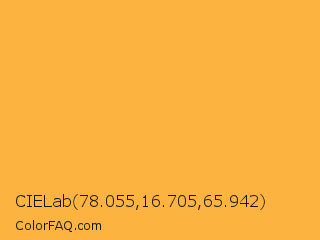 CIELab 78.055,16.705,65.942 Color is a light orange color and the nearest color is Yellow Orange #ffae42. Hex code #fcb340 and RGB value is rgb(252,179,64). In RGB color space, this color is composed of 99% red, 70% green, 25% blue, In CMYK color space, this color is composed of 0% cyan, 29% magenta, 75% yellow , 1% black , In HSL color space, this color has a hue angle of 37° , 97% saturation and 62% lightness.