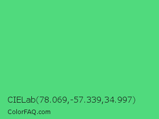 CIELab 78.069,-57.339,34.997 Color is a normal green color and the nearest color is Emerald #50c878. Hex code #50da7d and RGB value is rgb(80,218,125). In RGB color space, this color is composed of 31% red, 85% green, 49% blue, In CMYK color space, this color is composed of 63% cyan, 0% magenta, 43% yellow , 15% black , In HSL color space, this color has a hue angle of 140° , 65% saturation and 58% lightness.