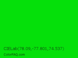 CIELab 78.09,-77.801,74.537 Color is a normal green color and the nearest color is Green #00ff00. Hex code #05e00a and RGB value is rgb(5,224,10). In RGB color space, this color is composed of 2% red, 88% green, 4% blue, In CMYK color space, this color is composed of 98% cyan, 0% magenta, 96% yellow , 12% black , In HSL color space, this color has a hue angle of 121° , 96% saturation and 45% lightness.