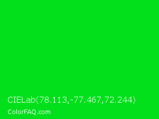 CIELab 78.113,-77.467,72.244 Color is a normal green color and the nearest color is Vivid Malachite #00cc33. Hex code #02e01b and RGB value is rgb(2,224,27). In RGB color space, this color is composed of 1% red, 88% green, 11% blue, In CMYK color space, this color is composed of 99% cyan, 0% magenta, 88% yellow , 12% black , In HSL color space, this color has a hue angle of 127° , 98% saturation and 44% lightness.