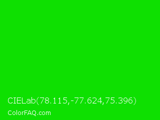 CIELab 78.115,-77.624,75.396 Color is a normal green color and the nearest color is Green #00ff00. Hex code #0ee001 and RGB value is rgb(14,224,1). In RGB color space, this color is composed of 5% red, 88% green, 0% blue, In CMYK color space, this color is composed of 94% cyan, 0% magenta, 100% yellow , 12% black , In HSL color space, this color has a hue angle of 117° , 99% saturation and 44% lightness.