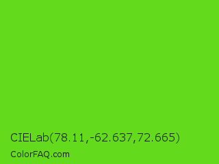 CIELab 78.11,-62.637,72.665 Color is a normal green color and the nearest color is Harlequin Green #46cb18. Hex code #63db1c and RGB value is rgb(99,219,28). In RGB color space, this color is composed of 39% red, 86% green, 11% blue, In CMYK color space, this color is composed of 55% cyan, 0% magenta, 87% yellow , 14% black , In HSL color space, this color has a hue angle of 98° , 77% saturation and 48% lightness.