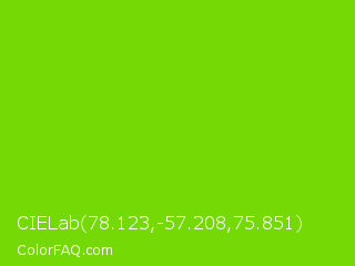CIELab 78.123,-57.208,75.851 Color is a normal green color and the nearest color is Alien Armpit #84de02. Hex code #75d906 and RGB value is rgb(117,217,6). In RGB color space, this color is composed of 46% red, 85% green, 2% blue, In CMYK color space, this color is composed of 46% cyan, 0% magenta, 97% yellow , 15% black , In HSL color space, this color has a hue angle of 88° , 95% saturation and 44% lightness.