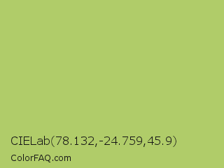 CIELab 78.132,-24.759,45.9 Color is a light lime color and the nearest color is Wild Willow #b9c46a. Hex code #b0cc69 and RGB value is rgb(176,204,105). In RGB color space, this color is composed of 69% red, 80% green, 41% blue, In CMYK color space, this color is composed of 14% cyan, 0% magenta, 49% yellow , 20% black , In HSL color space, this color has a hue angle of 77° , 49% saturation and 61% lightness.